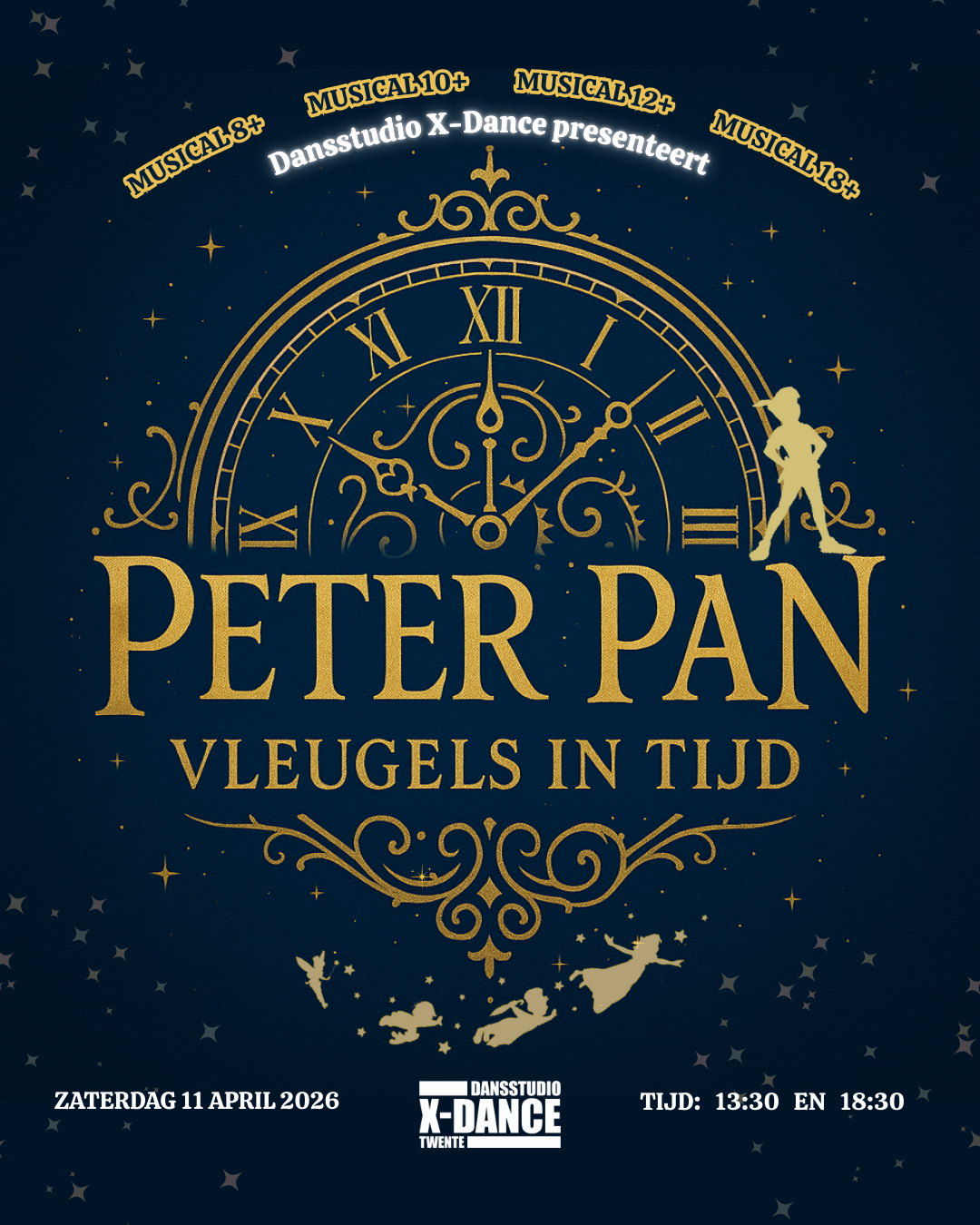 Dansstudio X-Dance presenteert met haar musicalgroepen een geheel nieuwe musicalvoorstelling: Peter Pan – Vleugels in Tijd. Een frisse, creatieve bewerking van het klassieke verhaal, waarin leerlingen je meenemen in een wereld waar fantasie en werkelijkheid elkaar raken. De bewerking van het verhaal, het creatieve proces en de regie zijn in handen van Bas te Lintelo, musicaldocent bij Dansstudio X-Dance. Onder zijn leiding hebben de leerlingen intensief gewerkt aan spel, zang en dans om samen een magische theaterervaring neer te zetten.